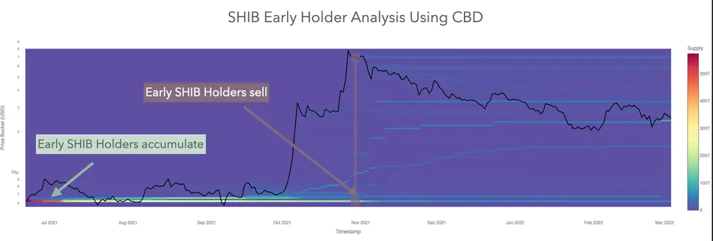 圖7↓熱力圖顯示SHIB早期持幣者在2021年1月低價區積累(紅黃區間),並於2021年10-11月市場峰值附近大規模抛售,表現為價格急漲、早期積累帶褪色及後續下跌。