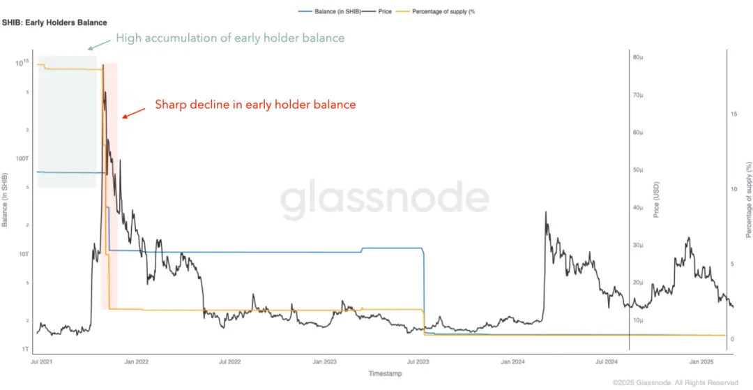 圖中藍綫代表SHIB持倉量,黃綫顯示早期持幣者佔總供應量百分比,清晰呈現其相對持倉演變及抛售活動的市場影響。