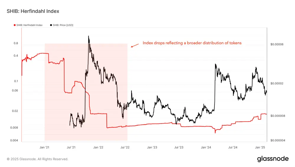 圖5↓展示SHIB赫芬達爾指數(紅綫)與價格(黑綫)。指數急跌對應大戶抛售持倉時刻,與價格峰值吻合。