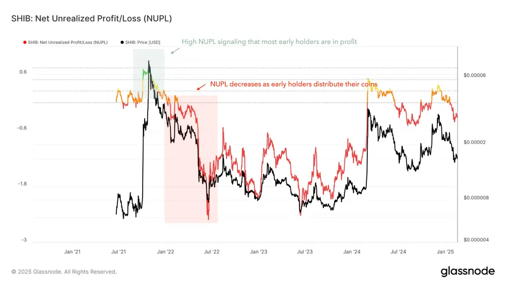 圖6↓將SHIB的NUPL與價格並列呈現,顯示早期高NUPL值與價格峰值重合,且常緊隨抛售。請重點關注首個價格峰值(對應早期持幣者最活躍階段,與餘額指標觀察一致)。