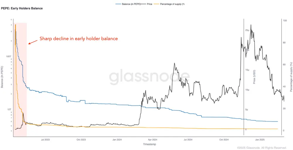 圖4↓中,PEPE早期持幣者在首次價格上漲後即抛售大部分代幣(左端橙色綫驟降):