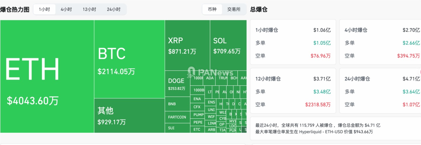 PANews 8月18日消息,Coinglass 數據顯示,過去1小時加密貨幣市場全網合約爆倉1.06億美元,其中空單爆倉近77萬美元,多單爆倉1.05億美元;ETH爆倉總金額為4043萬美元,BTC爆倉總金額為2114萬美元。