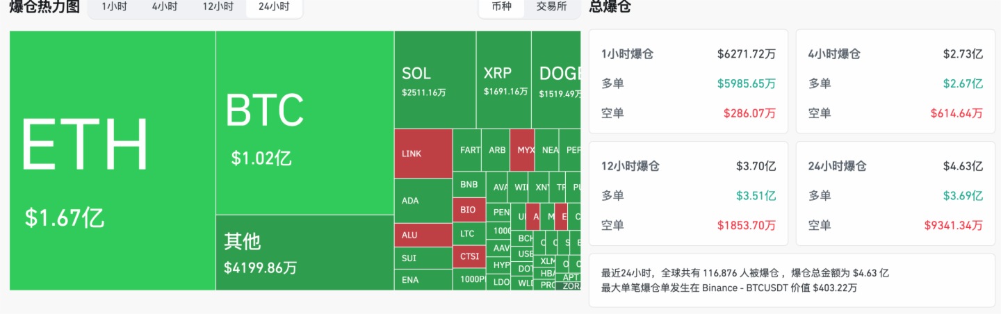 24小時爆倉數據:全球共116876人被爆倉 ,爆倉總金額為4.63億美元,其BTC爆倉1.02億美元、ETH爆倉1.67億美元、SOL爆倉2511萬美元
