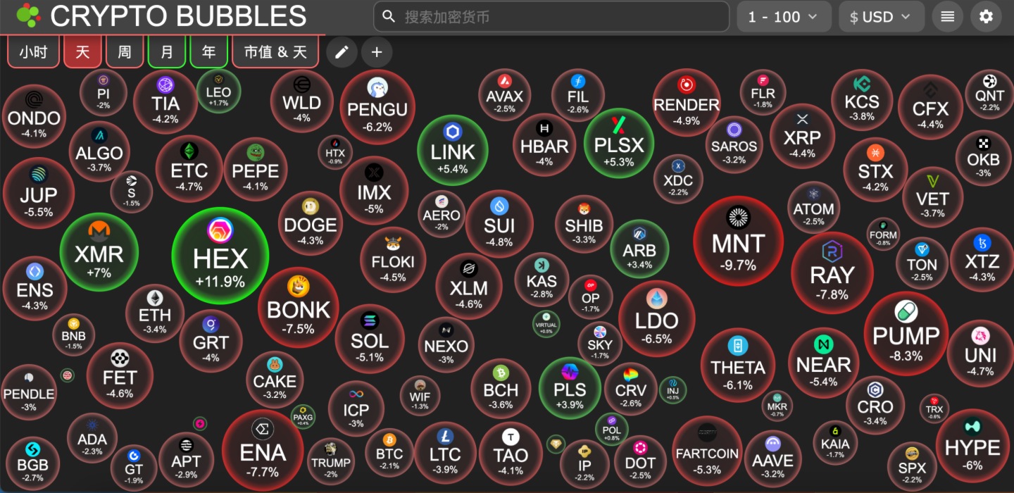 今日市值前100最大漲幅:HEX漲11.9%,Monero漲7%,Chainlink漲5.4%,PulseX漲5.3%,Pulsechain漲3.9%。