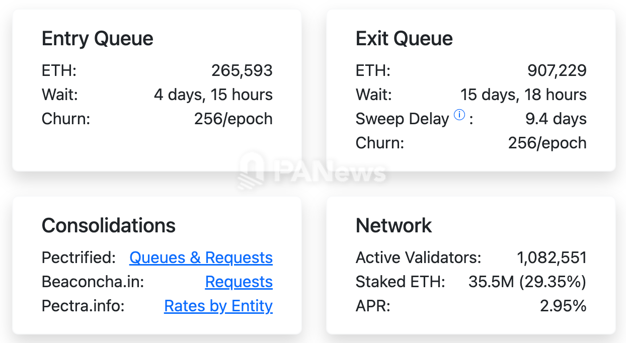 PANews 8月19日消息,據validatorqueue網站數據,截至目前,以太坊PoS網絡退出隊列ETH數量增至907,229枚,排隊退出等待時間約15天18小時。同期,待進場ETH為265,593枚,預計激活延遲約4天15小時。