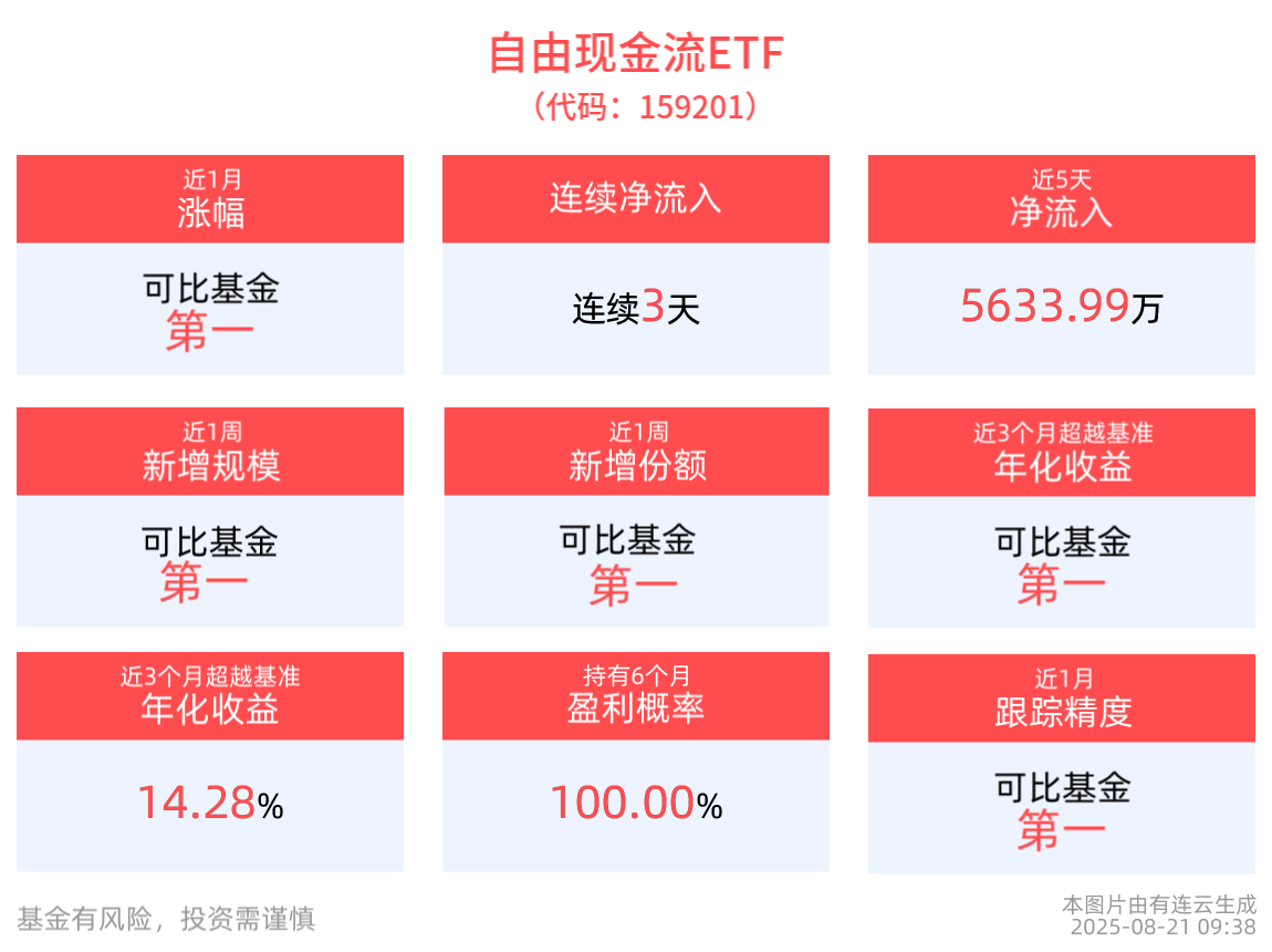 跟蹤精度方面,截至2025年8月20日,自由現金流ETF近1月跟蹤誤差為0.039%,在可比基金中跟蹤精度最高。
