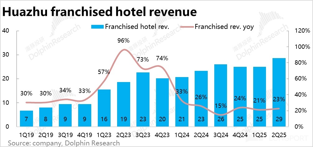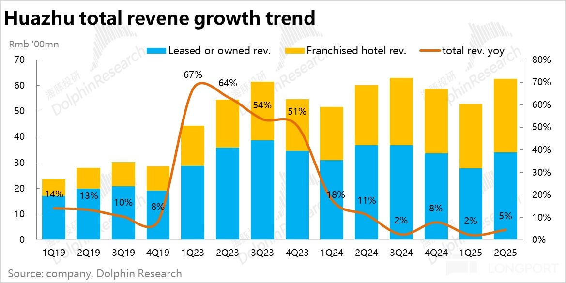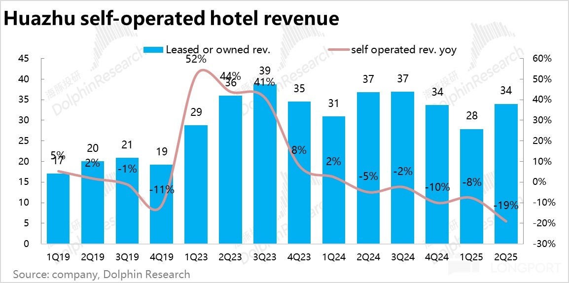 3、加盟業務持續高增。Q2 華住集團實現營收 64.3 億元,同比增長 4.5%,接近此前的指引上限(指引為 1%-5%),小幅超出市場一致預期。其中直營業務同比下滑 7.6%,核心問題在於老舊酒店(尤其是高綫市場)競爭力不足。