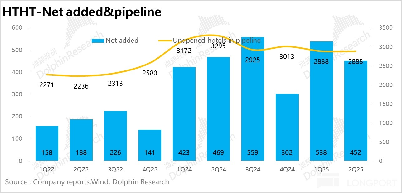 2、開店節奏加快。在整個行業經過 2024 年加速開店後,雖然整體加盟商投資意願降溫,但華住的開店節奏卻並未放緩。華住上半年合計淨新開酒店 991 家,相較於全年淨新開 1700 家門店的目標已經完成過半。其中開店主要集中於中高端和經濟型品牌,而關店則針對低效和老舊門店(如漢庭 2.5 以下版本)為主,優化整體的門店網絡結構。結合調研信息,二季度國内單體酒店加速倒閉,華住份額明顯提升。