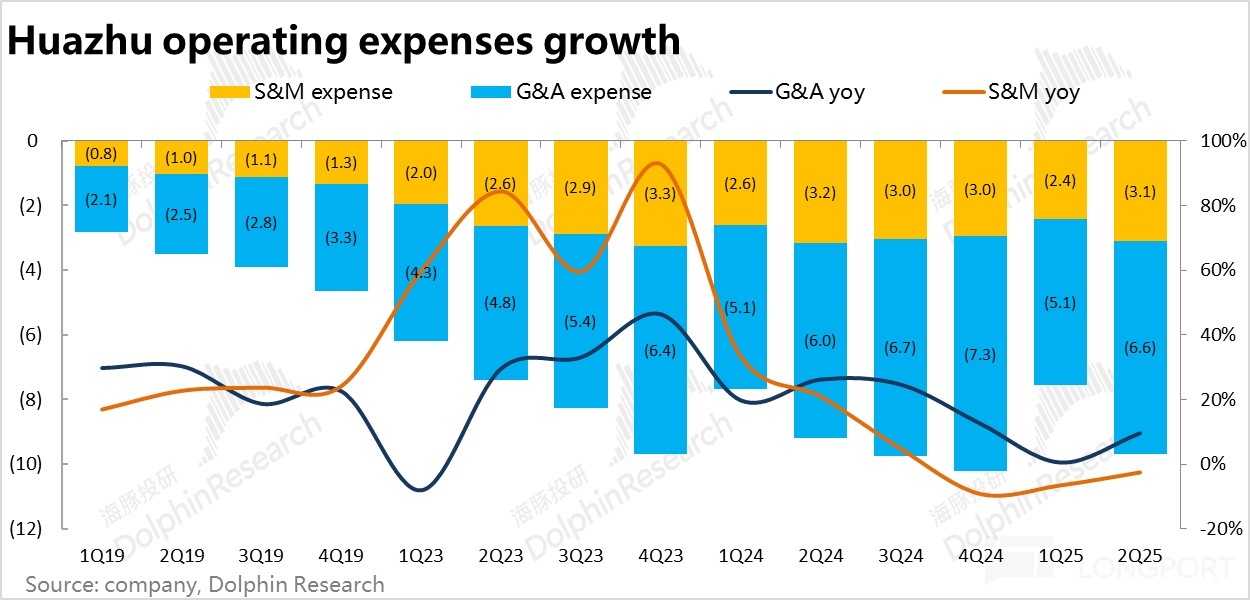 5、費用率保持穩定。費用率上在 RevPAR 下降的情況下整體保持穩定,最終,華住調整後 EBITDA 達到 22.8 億元,同比增長 11%,超出市場一致預期(20.7 億元)。