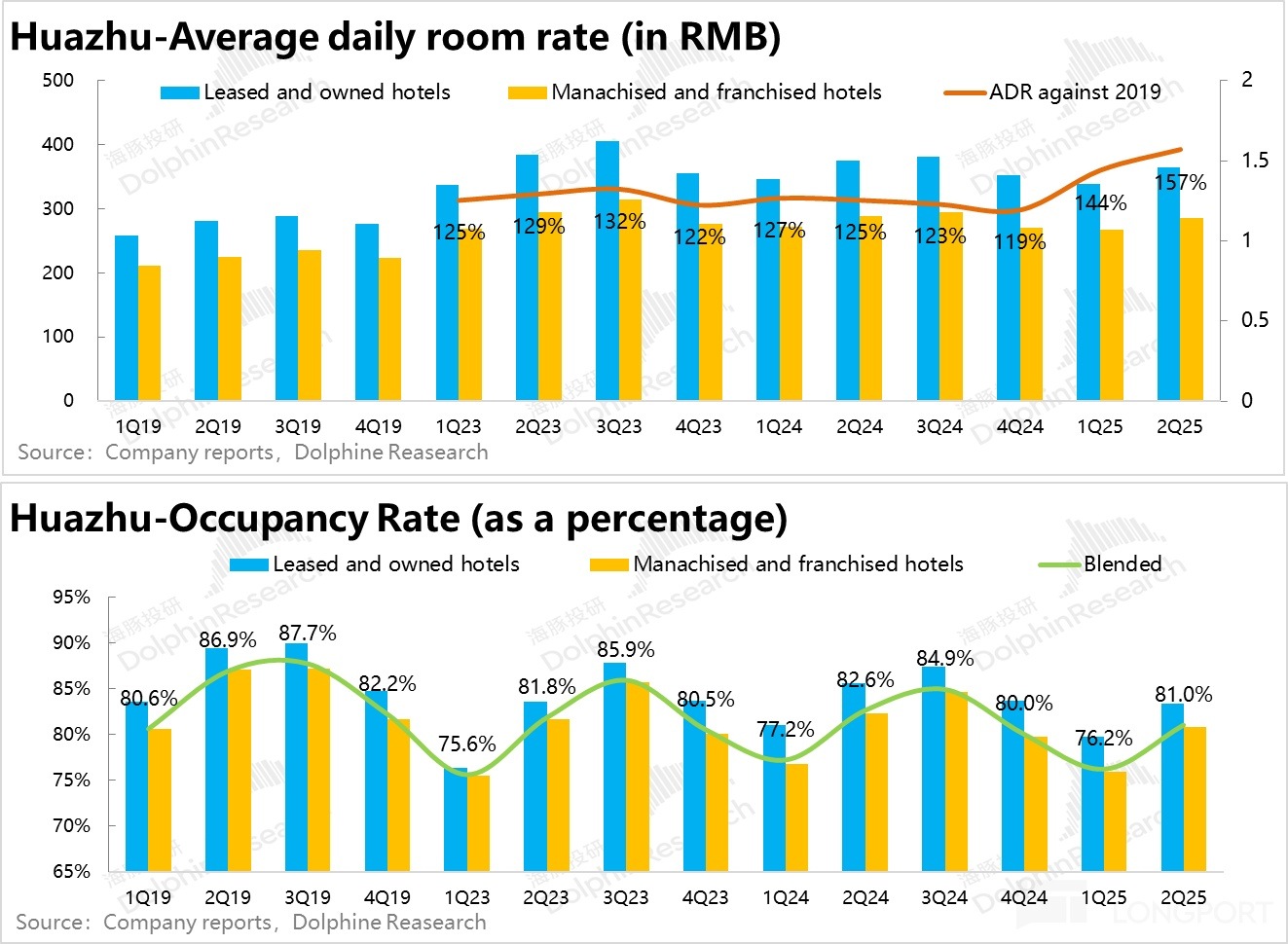 1、RevPAR 依然承壓。從最核心的經營指標每間可售房收入(RevPAR)看,二季度華住每間可售房收入為 235 元/晚,同比下降 3.7%,符合市場預期。量價拆分來看,雖然在供給過剩 + 商旅承壓的情況下,ADR 仍然表現疲軟,但在中高端品牌升級(漢庭、橘子等)順利的情況下降幅環比一季度有所收窄,同比下降 2%。但入住率(OCC)方面,由於新店導致競爭加劇,環比依然沒有好轉的迹象,同比下降 1.6%。