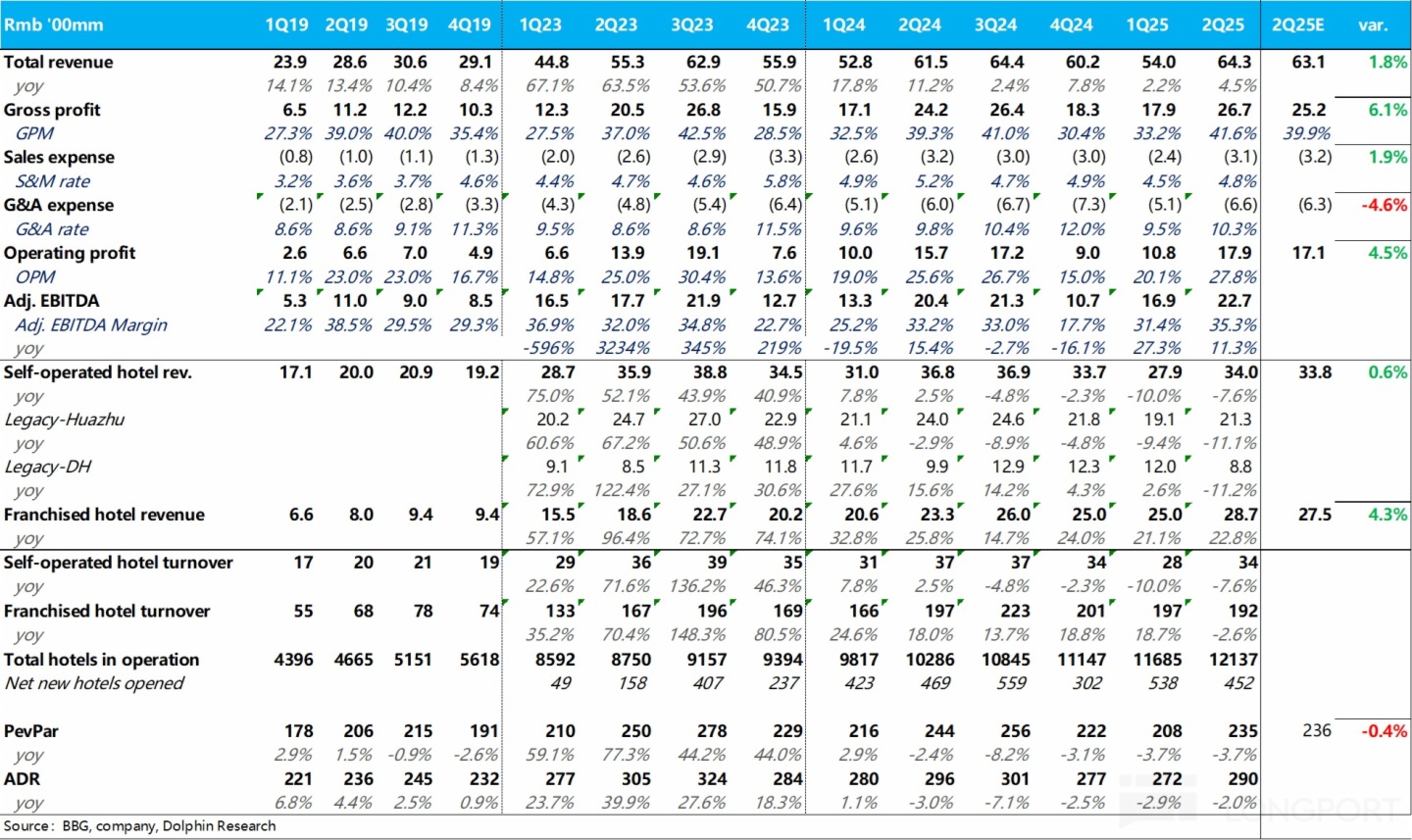 根據公司在電話會交流的信息,雖然二季度私人的休閑旅遊需求強勁,但宏觀經濟壓力下商務需求疲軟,使得酒店生意的整體創收能力仍在走弱。