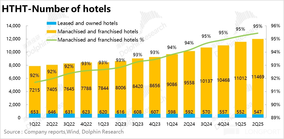 整體來說,雖然二季度在行業整體供給過剩、需求弱復蘇的背景下,雖然底層的核心經營數據 ADR,OCC 仍然在下滑,但華住自身的輕資産轉型戰略目前來看還是卓有成效的,這也是海豚君最滿意的地方。