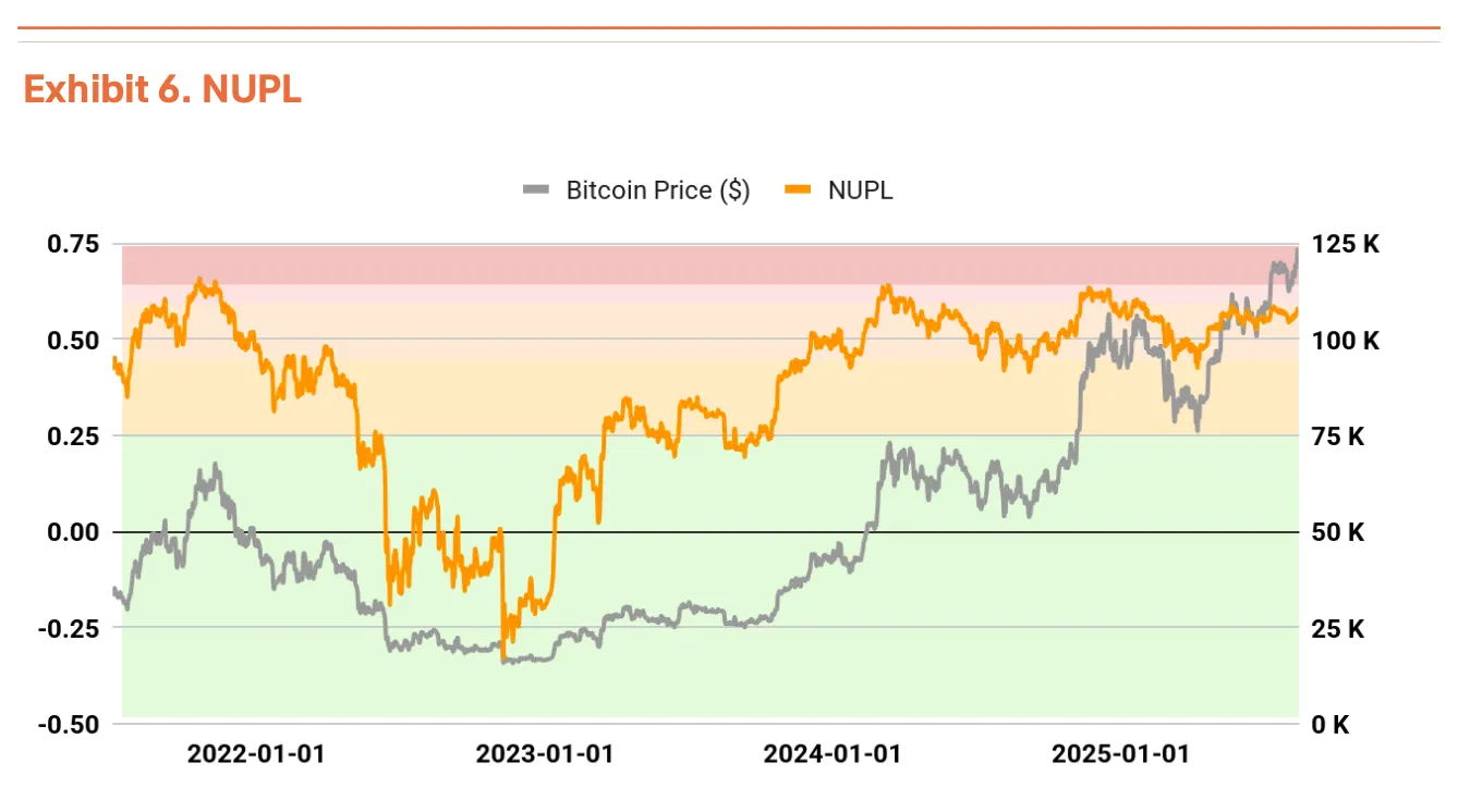 然而,追蹤投資者已實現盈利/虧損的aSOPR(1.019)和衡量市場整體未實現盈利/虧損的NUPL(0.558)均保持在穩定區域,表明市場整體健康(Exhibit 5, 6)。