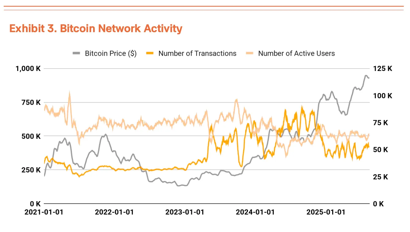然而,基本指標顯示出不平衡的增長。雖然機構重組顯然推動比特幣網絡價值升高,但交易筆數和活躍用戶數仍未恢復(Exhibit 3)。