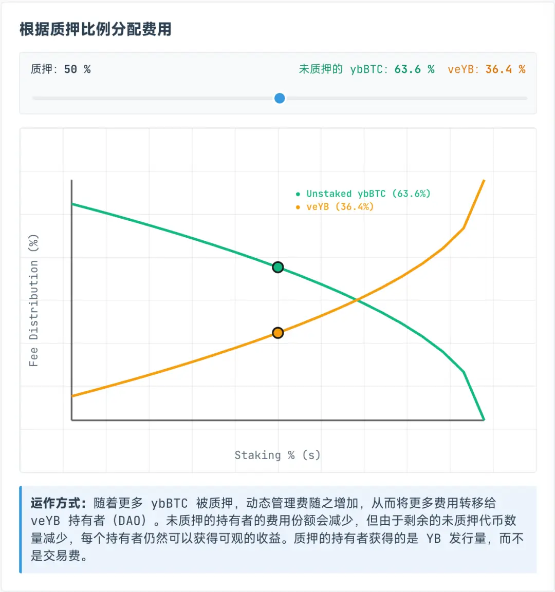 不過分配給 veYB 的手續費是動態的,其實是要在 ybBTC 和 veYB 持有人中動態劃分,其中 veYB 固定最低 10% 保底分成,也就是說,即使所有人都不質押 ybBTC,他們也只能獲得原始總收入的 45%,而 veYB 也就是 YB 自身可獲得總收入的 5%。