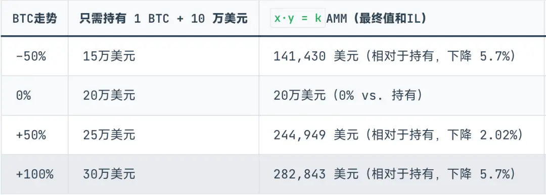 無償損失從整個鏈上經濟係統的視角而言,可以視為一種“期望”,LP 選擇了提供流動性,就不能再要求獲得持有的收益,所以,本質上無償損失更多是一種“會計”式的記賬損失,而不應該被作為一種真實的經濟損失,相比於持有 BTC,LP 也可以獲得手續費。