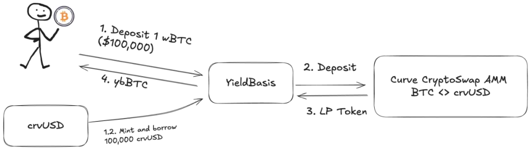 1. 用戶存入(cbBTC/tBTC/wBTC)500 BTC,YB(Yield Basis)利用 500 BTC 借出等值 500 crvUSD,注意,此時是等值,利用閃電貸機制,不是完全的 CDP(本來約為 200% 質押率)