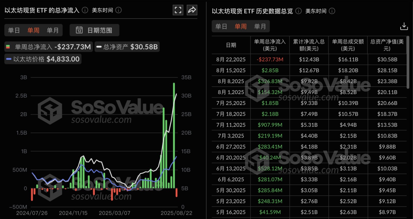 PANews 8月25日消息,根據 SoSoValue 數據,上周交易日(美東時間 8 月 18 日至 8 月 22 日)以太坊現貨 ETF 上周單周淨流出 2.38 億美元,連續14周淨流入遭終結。