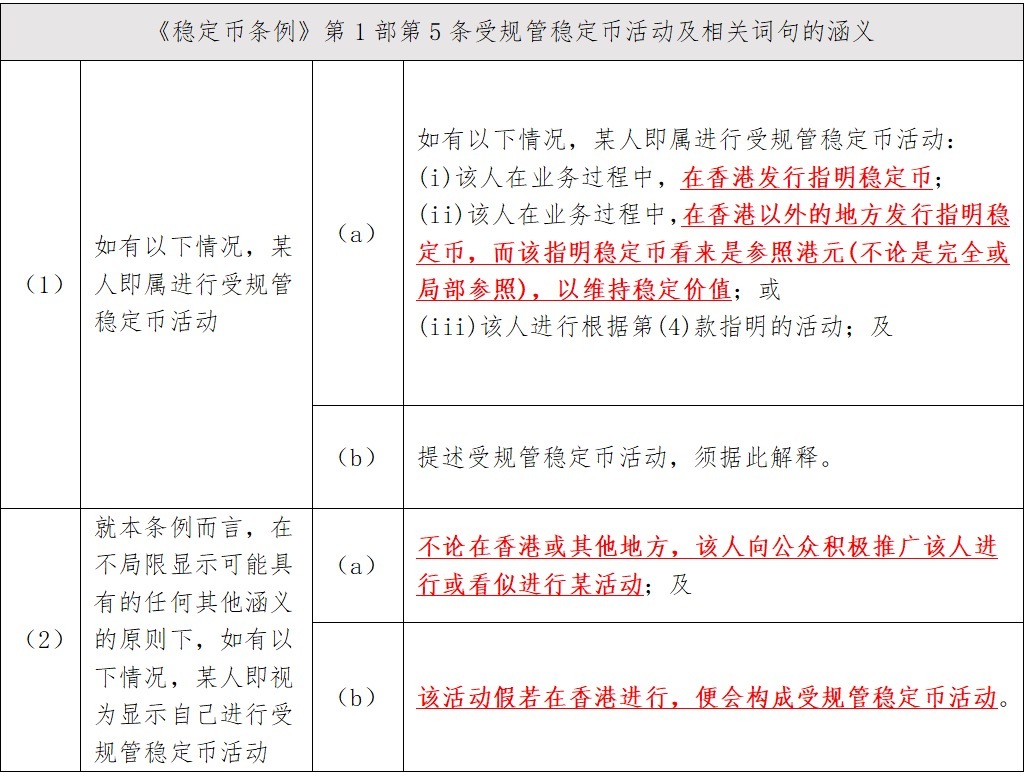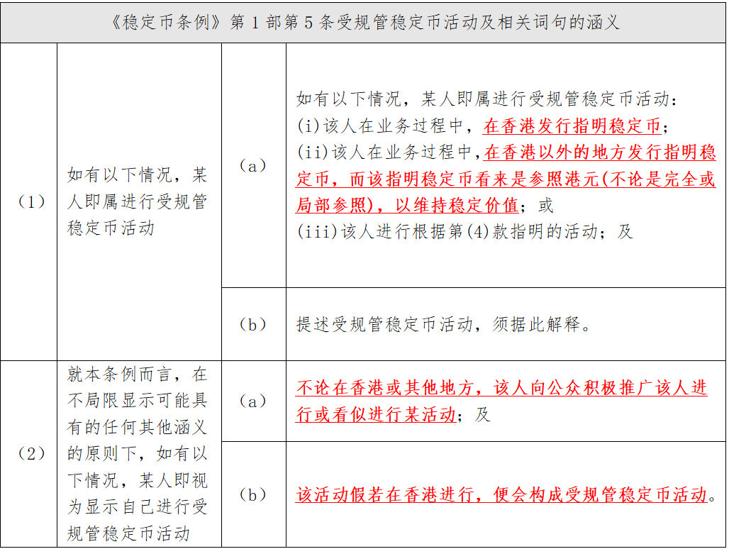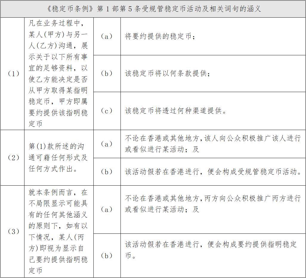 根據《穩定幣條例》第 1 部第 5 條(1)-(2),受規管穩定幣活動為: