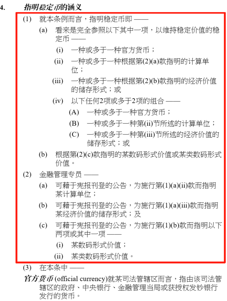 第 4 條規定的「指明穩定幣」這個概念就有點繞了,夥伴們可以簡單的理解為香港《穩定幣條例》為規管相關業務而獨創的一種法律上的「狹義的穩定幣概念」。具體原文如下:
