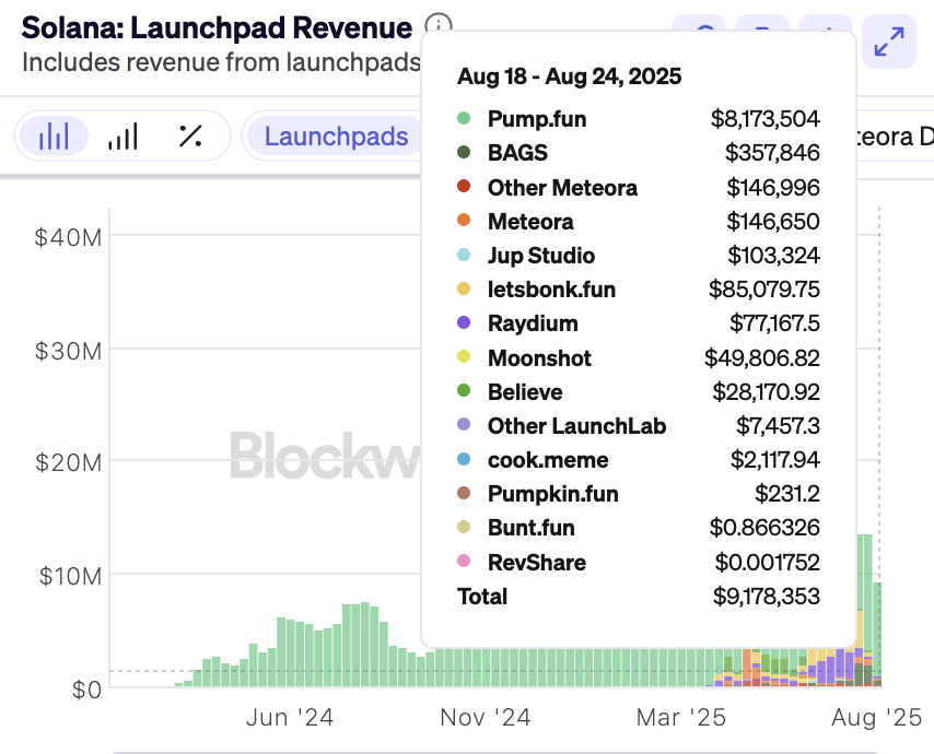 PANews 8月25日消息,據 SolanaFloor 監測,pump.fun 上周收入超過了 Solana 網絡所有其他 memecoin 啓動平台,佔總收入的近 90%。
