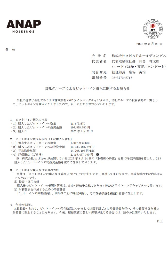 PANews 8月25日消息,據官方公告,日本時尚品牌ANAP增持11.6773枚BTC,目前總共持有1017.9838枚BTC。