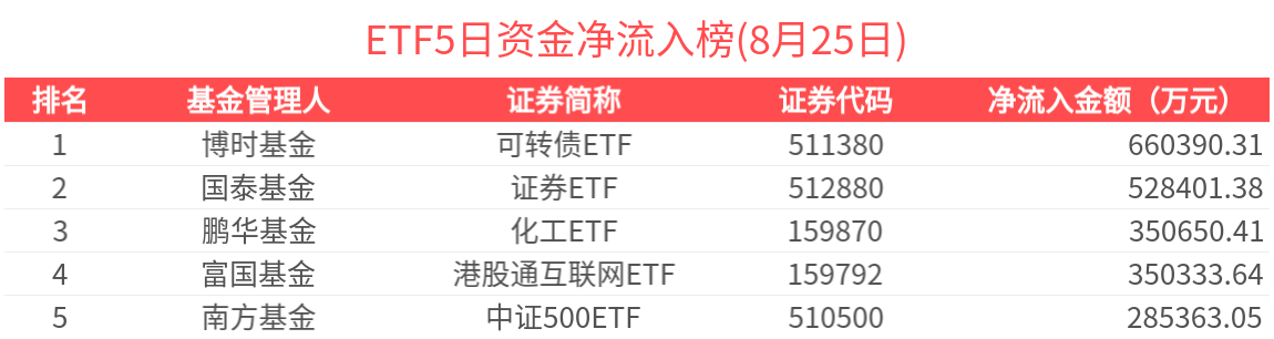 2025年8月25日共422只ETF基金獲資金淨流入,394只ETF基金淨流出。淨流入金額超1億元的有73只,證券ETF(512880.SH)、可轉債ETF(511380.SH)、化工ETF(159870.SZ)、券商ETF(512000.SH)、金融科技ETF(159851.SZ)資金顯著流入,分別淨流入24.26億元、17.98億元、14.96億元、11.16億元、9.81億元(淨申購份額*單位淨值)。