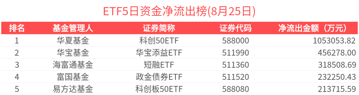 淨流出金額超1億元的有35只,科創50ETF(588000.SH)、中證500ETF(510500.SH)、華寶添益ETF(511990.SH)、創業板ETF(159915.SZ)、創業板50ETF(159949.SZ)資金顯著流出,分別淨流出22.23億元、11.83億元、9.43億元、8.57億元、6.26億元(淨贖回份額*單位淨值)。