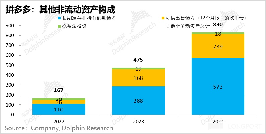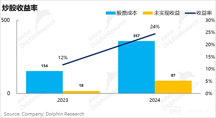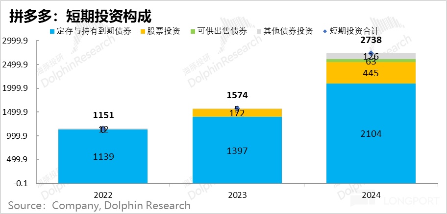 但有意思的是,由於公司金庫堆積過快,從 2023 年開始,拼多多開始炒股了,23 年還只有 172 億的餘額,到了 24 年已經有 445 億人民幣。