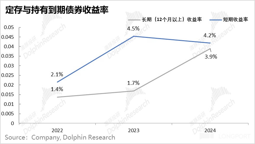 b. 配置中佔比最高的定存和持有到期債券(保本生息性理財)收益率基本是在 4% 上下,與這兩年的對應期限的美債收益率也基本相符。