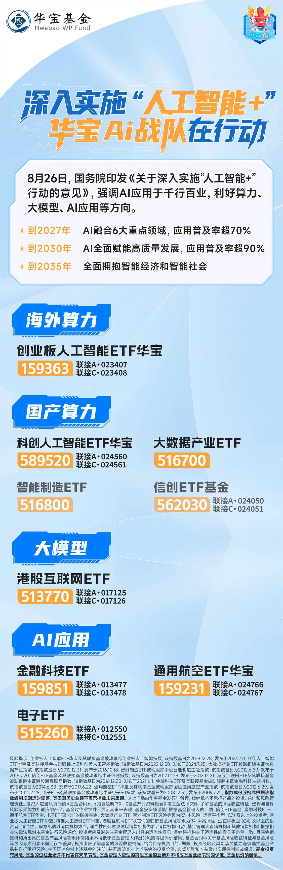 風險提示:創業板人工智能ETF被動跟蹤創業板人工智能指數,該指數基日為2018.12.28,發佈日期為2024.7.11。港股互聯網ETF被動跟蹤中證港股通互聯網指數,該指數基日為2016.12.30,發佈於2021.1.11。金融科技ETF被動跟蹤中證金融科技主題指數,該指數基日為2014.6.30,發佈日期為2017.6.22。科創人工智能ETF被動跟蹤上證科創板人工智能指數,該指數基日為2022.12.30,發佈於2024.7.25。大數據産業ETF被動跟蹤中證大數據産業指數,該指數基日為2012.12.31,發佈於2016.10.18。通用航空ETF被動跟蹤國證通用航空産業指數,該指數基日為2012.6.29,發佈日期為2012.12.28。電子ETF被動跟蹤中證電子50指數,該指數基日為2008.12.31,發佈於2009.7.22。信創ETF基金被動跟蹤中證信創指數,該指數基日為2017.12.29,發佈於2012.12.21。智能制造ETF被動跟蹤中證智能制造主題指數,該指數基日為2012.6.29,發佈日期為2016.7.20。華寶上證科創板芯片指數基金跟蹤上證科創板芯片指數,該指數基日為2019.12.31,發佈日期為2022.6.13。指數成份股構成根據該指數編制規則適時調整,其回測歷史業績不預示指數未來表現。基金管理人評估的創業板人工智能ETF、港股互聯網ETF、科創人工智能ETF、華寶上證科創板芯片指數基金風險等級為R4-中高風險,適宜積極型(C4)及以上的投資者,適當性匹配意見請以銷售機構為準。基金管理人評估的金融科技ETF、大數據産業ETF、通用航空ETF、電子ETF、信創ETF、智能制造ETF風險等級為R3-中風險,適宜平衡型(C3)及以上投資者,適當性匹配意見請以銷售機構為準。任何在本文出現的信息(包括但不限於個股、評論、預測、圖表、指標、理論、任何形式的表述等)均只作為參考,投資人須對任何自主決定的投資行為負責。另,本文中的任何觀點、分析及預測不構成對閱讀者任何形式的投資建議,亦不對因使用本文内容所引發的直接或間接損失負任何責任。基金投資有風險,基金的過往業績並不代表其未來表現,基金管理人管理的其他基金的業績並不構成基金業績表現的保證,基金投資須謹慎。