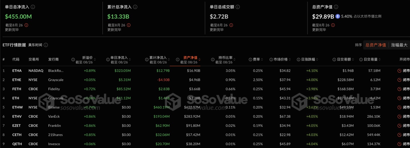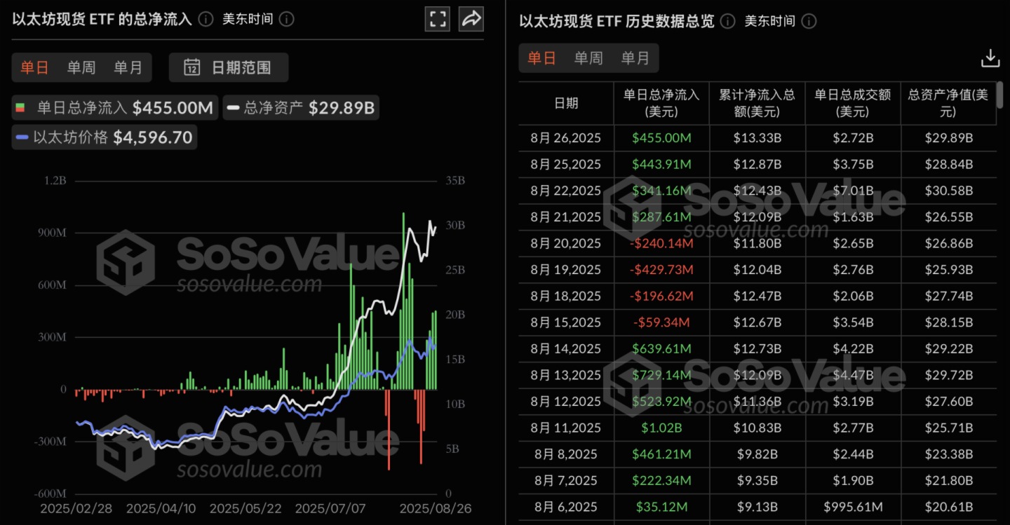 PANews 8月27日消息,根據 SoSoValue 數據,昨日(美東時間 8 月 26 日)以太坊現貨 ETF 總淨流入 4.55 億美元。