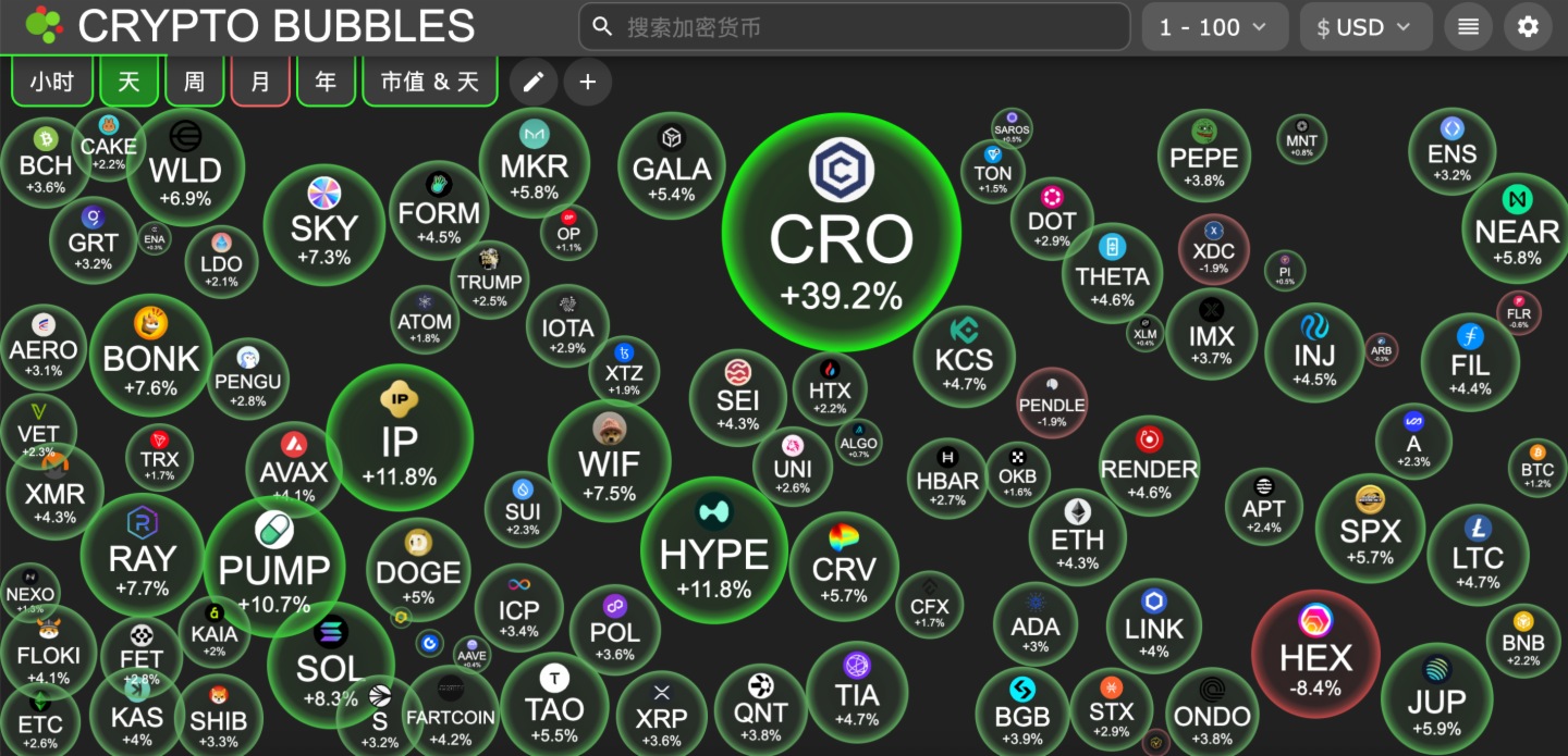 今日市值前100最大漲幅:Cronos漲39.2%,Hyperliquid漲11.8%,Story漲11.8%,Pump.fun漲10.7%,Solana漲8.3%。