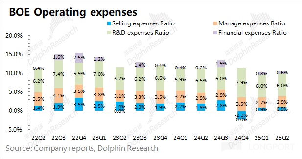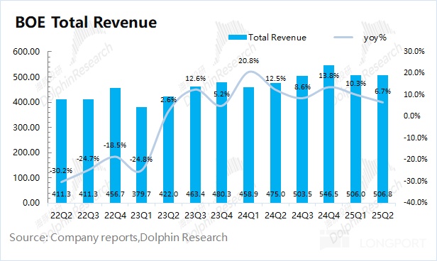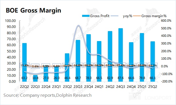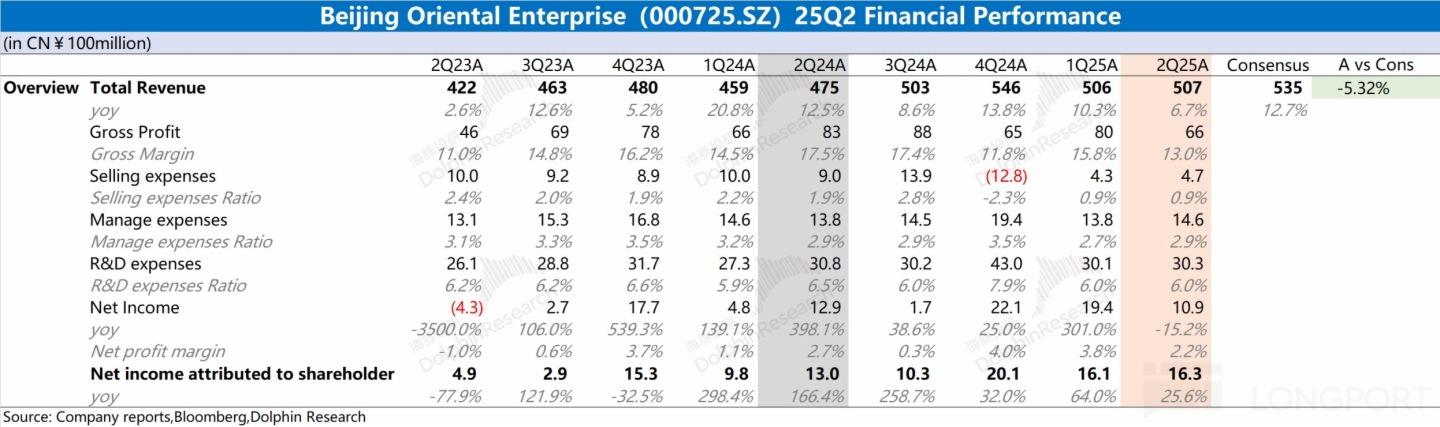 1.整體業績:京東方 2025 年第二季度實現營收 507 億元,同比增長 6.7%。此前公司收入的大幅回升,主要是受面板價格回暖的帶動。由於下遊需求未見大幅好轉,價格提升面臨阻力,公司近期的單季度收入也穩定在 500 億附近。京東方 2025 年第二季度歸母淨利潤為 16.3 億元,這主要是受少數股東權益的影響。若剔除該影響,公司本季度淨利潤為 10.9 億元,同比下滑 15% 左右,主要是受毛利率下滑的影響。