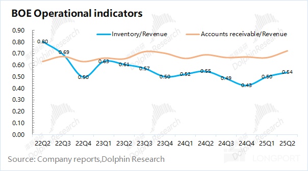 4.存貨及價格變動:京東方在 2025 年第二季度的存貨增加至 273 億元,環比增長 7.8%。公司本季度存貨/收入的比值維持在 0.54。存貨季節性提升,主要是為下半年旺季的備貨準備。從存貨比值看,當前公司産品的下遊需求相對平穩,未看到明顯好轉的迹象。