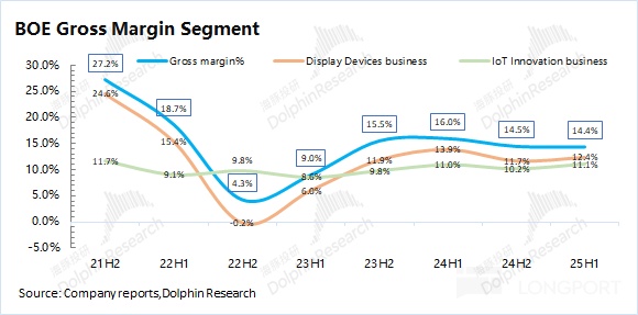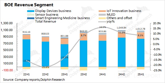3.具體業務來看:顯示器件和物聯網創新業務是公司最大的收入來源,合計佔比達到 95% 以上。其中 2025 年上半年顯示器件業務同比增長 8.1%,在面板價格同比保持相對平穩的情況下,增長主要來自於出貨量的提升;物聯網創新業務同比增長 6%,雖然扭轉了去年下滑的頹勢,但整體需求仍相對較弱。