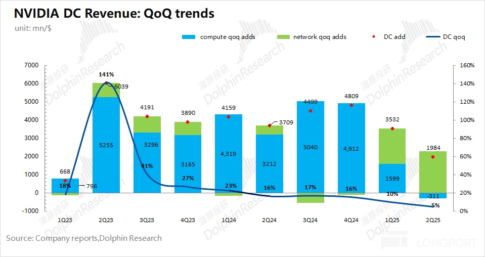 本季度數據中心業務環比增長,主要來自於網絡業務的帶動,而計算業務受 H20 影響大約有 40 億美元。若剔除該影響,計算業務收入本季度環增有將近 35 億美元左右。