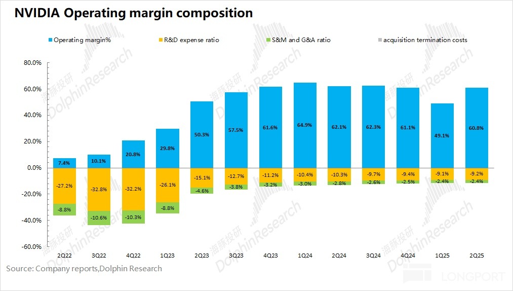 2026 財年第二季度英偉達核心經營利潤率為 60.8%,明顯回升。公司上季度受 H20 存貨減計的計提費用,導致了毛利率的 「閃崩」。