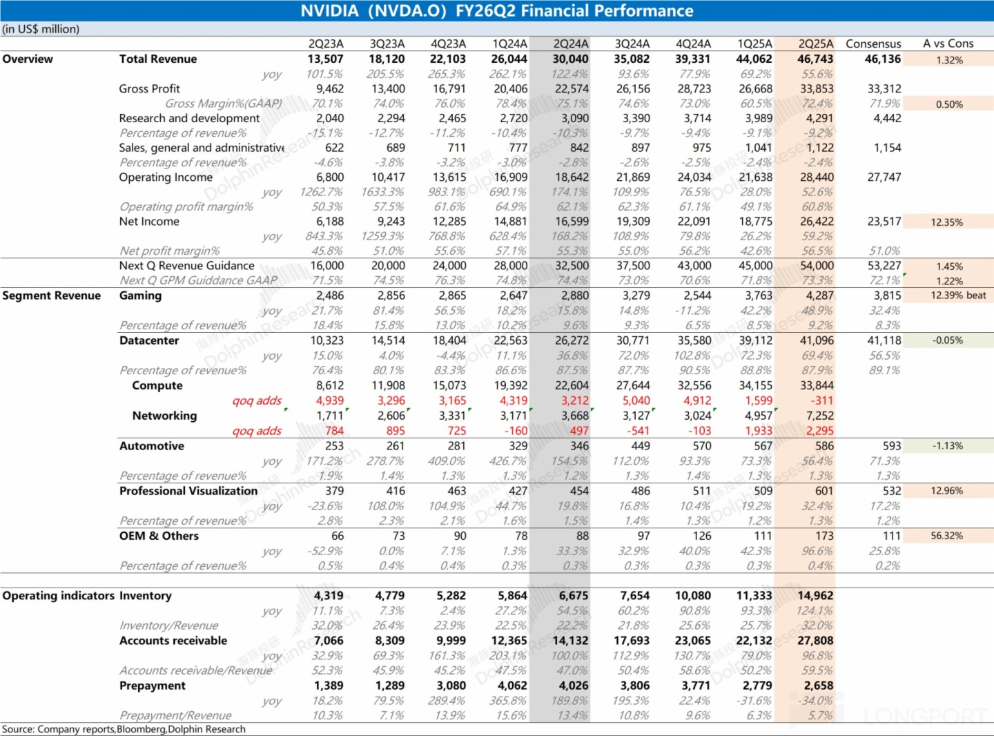 1.核心經營指標:$英偉達(NVDA.US) 本季度總收入 467 億美元,市場預期(461 億美元),其中季度環比增長 27 億美元,主要是受數據中心業務和遊戲業務的帶動。毛利率 72.4%,市場預期(71.9%)。公司上季度毛利率出現明顯滑落,主要是受H20 芯片計提存貨減值大約有 45 億左右的影響。若剔除該突發事件影響,上季度的毛利率將在 71% 附近,本季度繼續提升,主要是 GB 係列量産增加的推動。