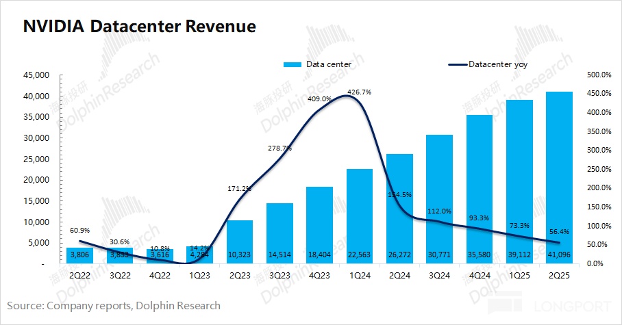 對於英偉達數據中心業務的核心驅動點仍然是雲服務廠商對 AI 服務器的需求。2025 年第二季度四大核心雲廠商的合計資本開支達到 958 億美元,同比增長 64.4%。結合公司數據中心業務 70% 的同比增速來看(不考慮 H20 影響的情況下),英偉達在巨頭資本開支中的份額仍在提升。