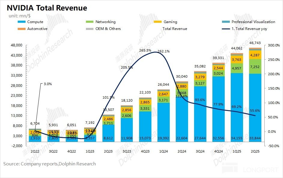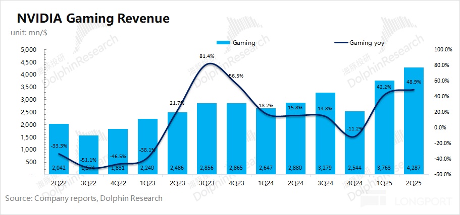2.數據中心:本季度收入 411 億美元,同比增長 69.4%,其中本季度大約有 6.5 億美元的 H20 銷往中國以外的其他地區。受 H20 被禁事件的影響,本季度的收入中沒有 H20 銷往中國地區的收入貢獻。由於一季度中大約包含的 46 億美元的相關收入,總收入增量在 70 億美元左右,扣除遊戲業務等部分 7 億美元的增量,GB 係列等産品帶動數據中心業務增量達到 63 億美元左右。