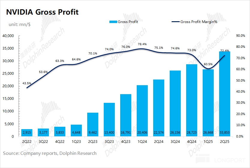 如不考慮 H20 突發事件的影響,將 45 億美元存貨減計加回來後,公司上季度的毛利率將重回 71% 附近。本季度毛利率實際上仍是環比提升的(71%->72.4%),主要是受 GB 係列量産增加以及供應鏈成本減少的影響。