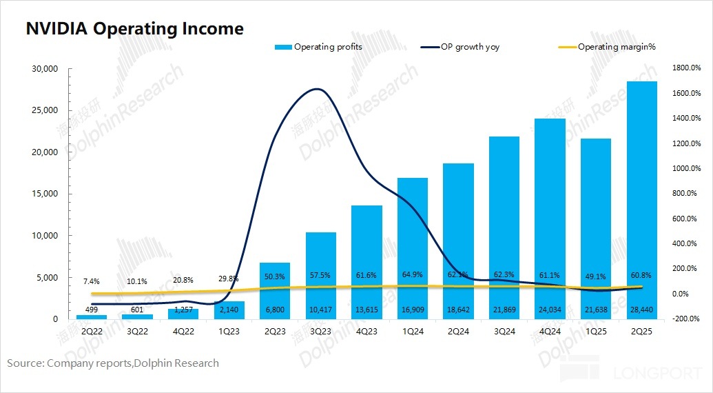 由於淨利潤還受到非經營性項目的影響,海豚君相對更關注於公司的核心經營利潤(毛利- 研發費用- 銷售、行政等費用)。公司本季度核心經營利潤 284 億美元,同比增長 52.6%。核心經營利潤率回升至 60.8%。上季度利潤端的下滑,主要是受 H20 存貨減值的影響。隨著毛利率的回升,公司核心經營利潤率依然穩定在 60% 上方。