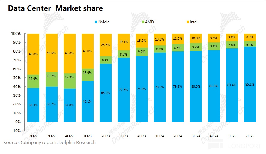由於當前在數據中心市場英偉達、AMD 和英特爾仍是核心芯片的主要玩家,將三者相關業務對比,可以看出:憑借公司領先的算力産品,英偉達在數據中心市場中的份額在持續增長。隨著 GB 係列産品量産提升,雲服務廠商在核心芯片採購方面,對英偉達的産品是更加青睐的。