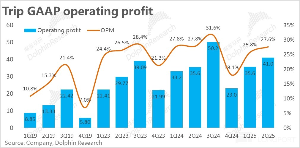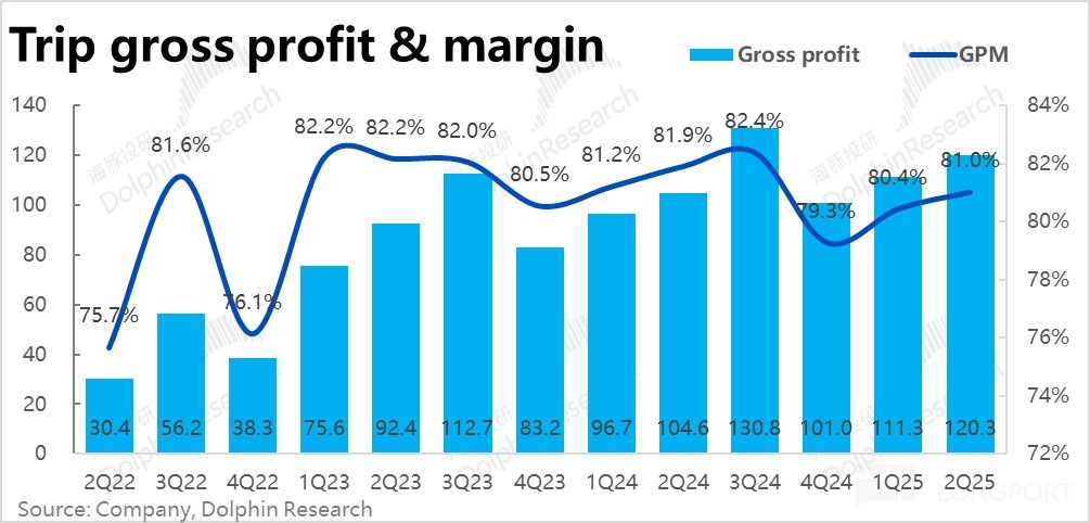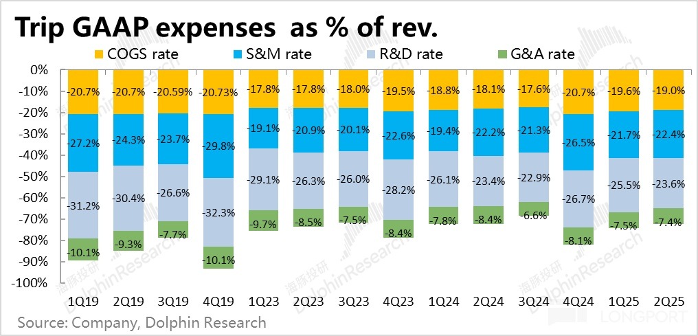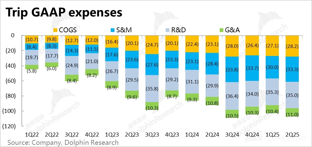 4、本季攜程的毛利率為 81%,如同預期的環比回升,但同比角度還是收縮 0.9pct。結合公司的披露,毛利環比回升因當有本季酒店客單價和機票價格環比有所回暖的貢獻。但由於毛利率較低的純海外業務佔比在趨勢性走高,毛利率同比角度還是結構性下降。毛利潤額為 120 億,同比增長 15%,稍稍低於營收增速。