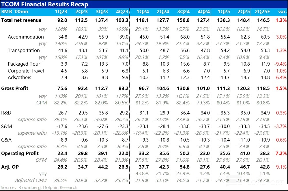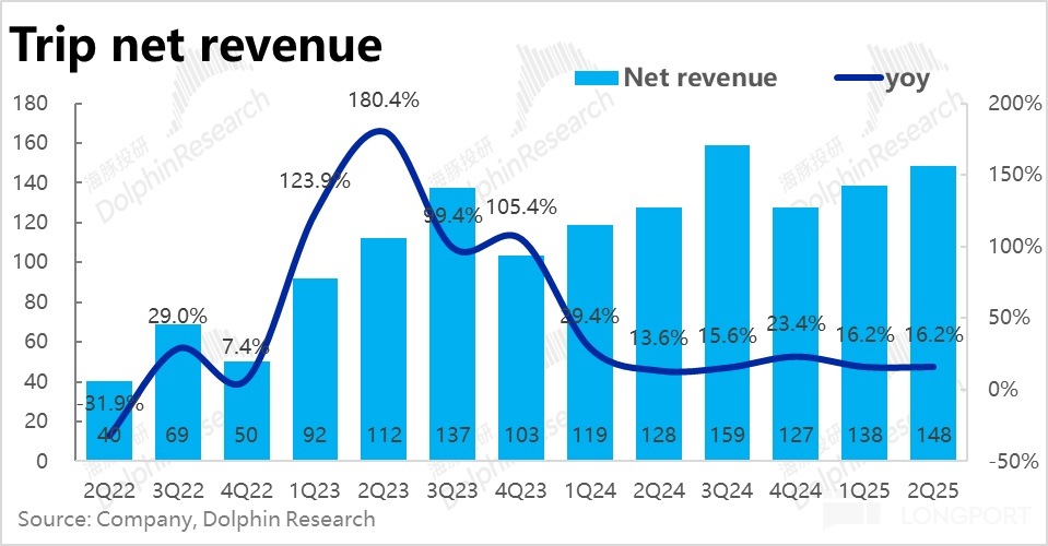 本季攜程集團整體實現淨收入 148 億元(剔除營業稅),同比增長 16%,環比增速較上季完全一致、並未放緩,稍高於市場預期。在當前中概資産範圍内,能長期且平穩保持 15% 上下的總營收增長,攜程再度驗證了其高可見度的相對成長股底色。