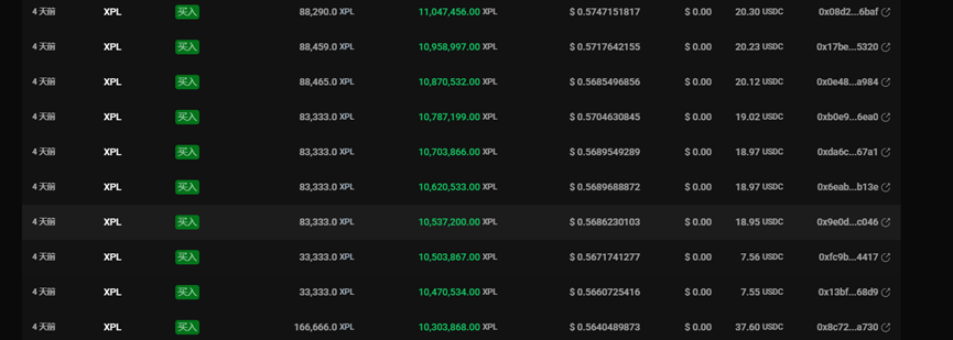 這幾個地址合計投入超過2000萬美元,在幾乎同一價格區間内,分批、分時地吸納了巨額多頭倉位。且其中幾個地址明顯在創建後就只進行了XPL這一個代幣的多單埋伏。