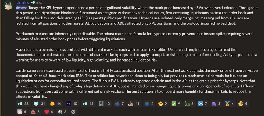 事件發生後,不少用戶也將希望投向Hyperliquid,期待平台方能夠給出一個說法或者補救行為。然而,Hyperliquid這一次並未像3月處理JELLY代幣被操控時那樣粗暴的對獲利訂單進行關閉和相關賬戶直接關停。而是在官方Discord社群中進行了回應,他們表示,XPL市場經歷了劇烈波動,但Hyperliquid的區塊鏈在此期間按照設計正常運行,沒有出現任何技術問題。清算和自動減倉(ADL)機制均按公共協議執行,且由於平台採用完全隔離的保證金制度,此次事件僅影響了XPL的頭寸,協議並未産生任何壞賬 。