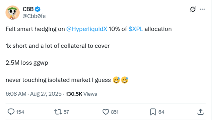 加密KOL@Cbb0fe表示,自己分配了10%的資金在Hyperliquid上進行對沖,結果因此虧損了250萬美元,再也不碰孤立市場了。