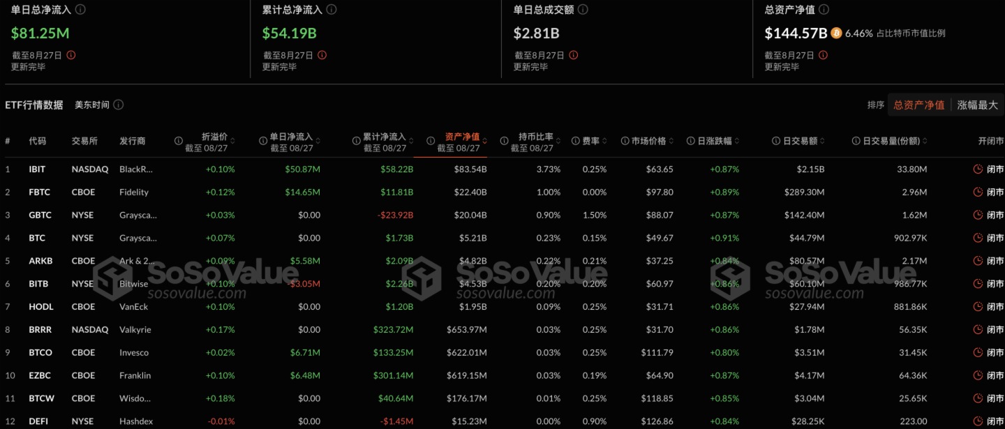 PANews 8月28日消息,根據 SoSoValue 數據,昨日(美東時間 8 月 27 日)比特幣現貨 ETF 總淨流入 8124.60 萬美元。